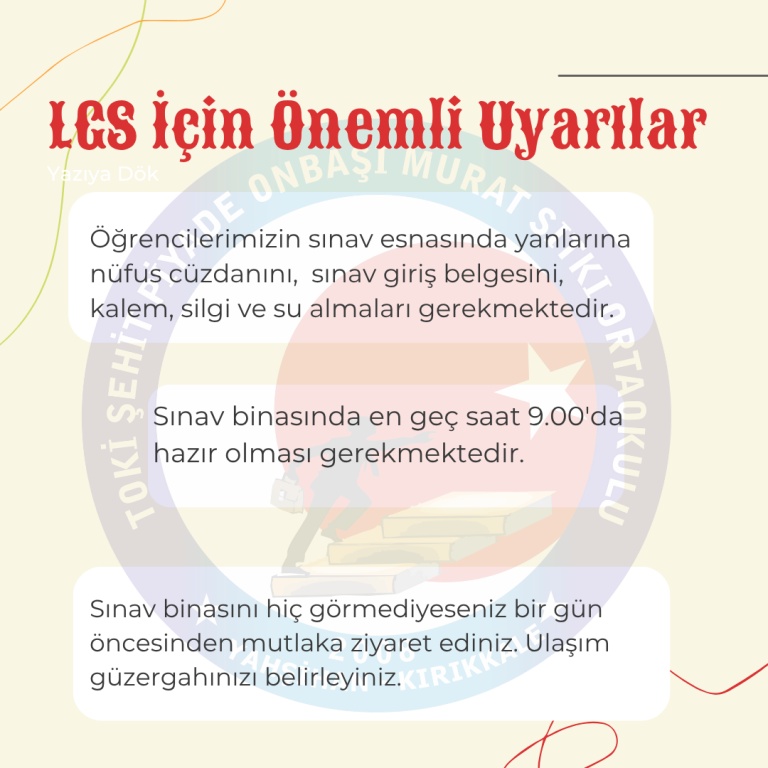 5 Haziran 2025 Pazar Gunu yapilacak olan LGS (Liselere gecis Sinav) icin uyarilar: